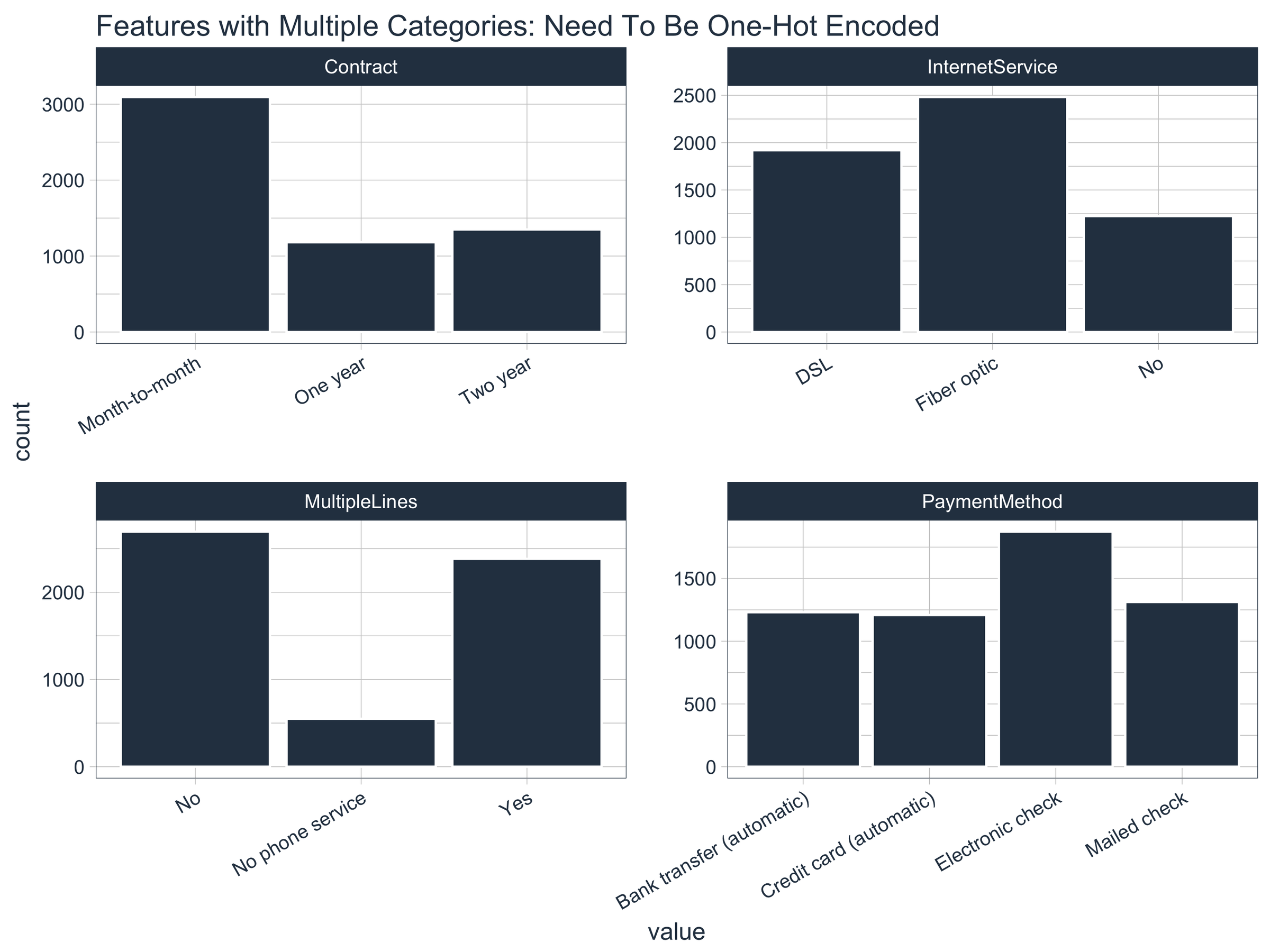 One-hot encoding is the process of converting categorical data to sparse data, which has columns of only zeros and ones (this is also called creating “dummy variables” or a “design matrix”). All non-numeric data will need to be converted to dummy variables. This is simple for binary Yes/No data because we can simply convert to 1’s and 0’s. It becomes slightly more complicated with multiple categories, which requires creating new columns of 1’s and 0`s for each category (actually one less). We have four features that are multi-category: Contract, Internet Service, Multiple Lines, and Payment Method.