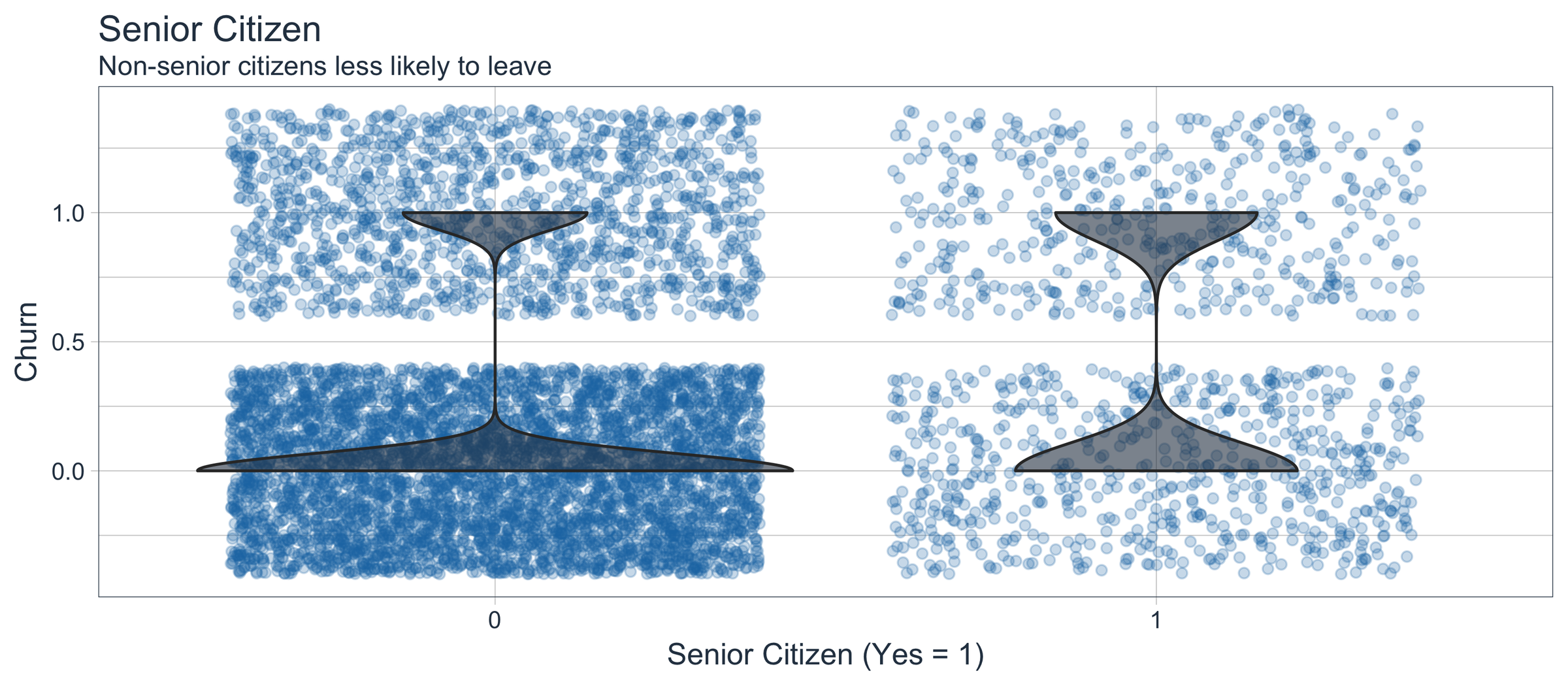 Senior citizen appeared in several of the LIME cases indicating it was important to the ANN for the 10 samples. However, it was not highly correlated to Churn, which may indicate that the ANN is using in an more sophisticated manner (e.g. as an interaction). It’s difficult to say that senior citizens are more likely to leave, but non-senior citizens appear less at risk of churning. Opportunity: Target users in the lower age demographic.