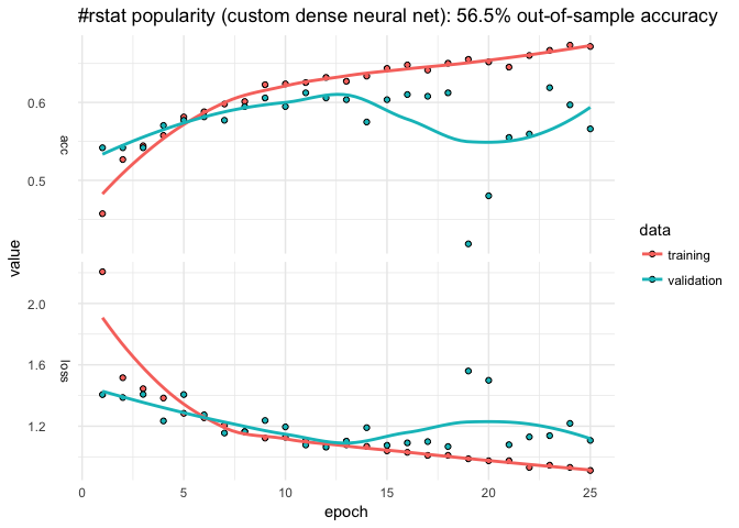 We could add more data, perhaps add individual words from the text or some other summary stat (mean(text %in% LETTERS) to see if all caps explains popularity). But let’s alter the neural net.