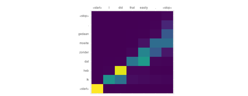 As you see it can be quite interesting watching the network’s “language capability” evolve. Now, how about subjecting our network to a little MRI scan? Since we’re collecting the attention weights, we can visualize what part of the source text the decoder is attending to at every timestep.