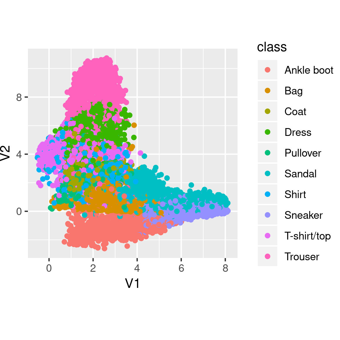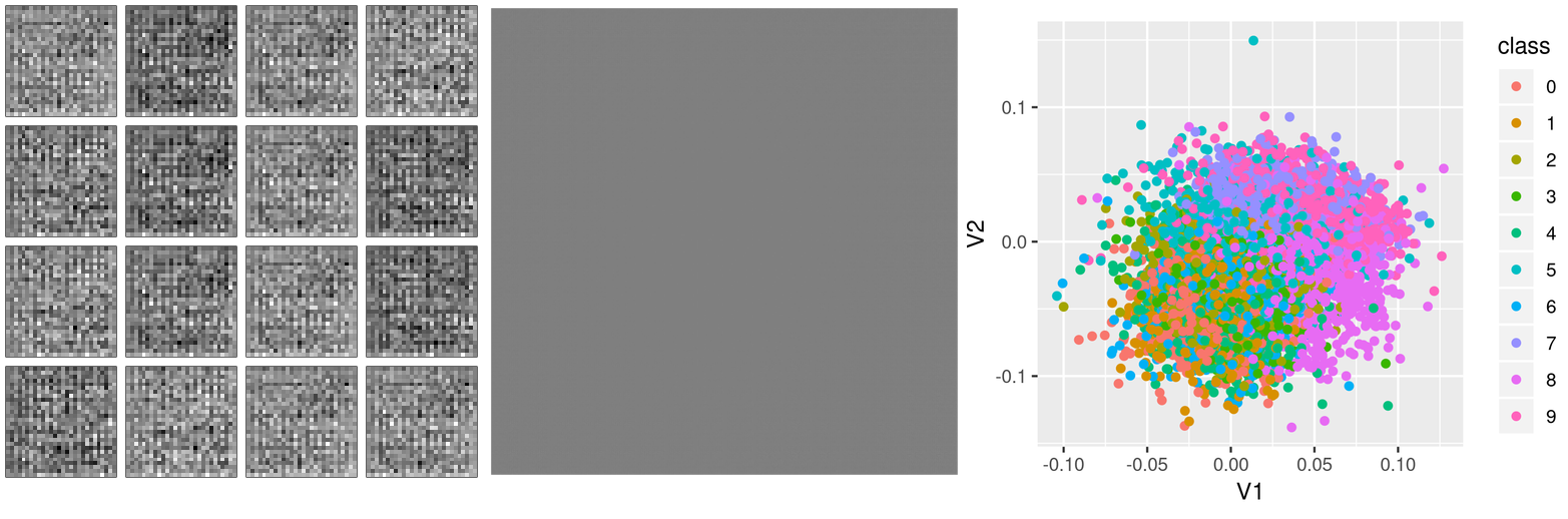 Let’s start training! Actually, before we do that, let’s have a look at what these functions display before any training: Instead of clothes, we see random pixels. Latent space has no structure. And different types of clothes do not cluster together in latent space.