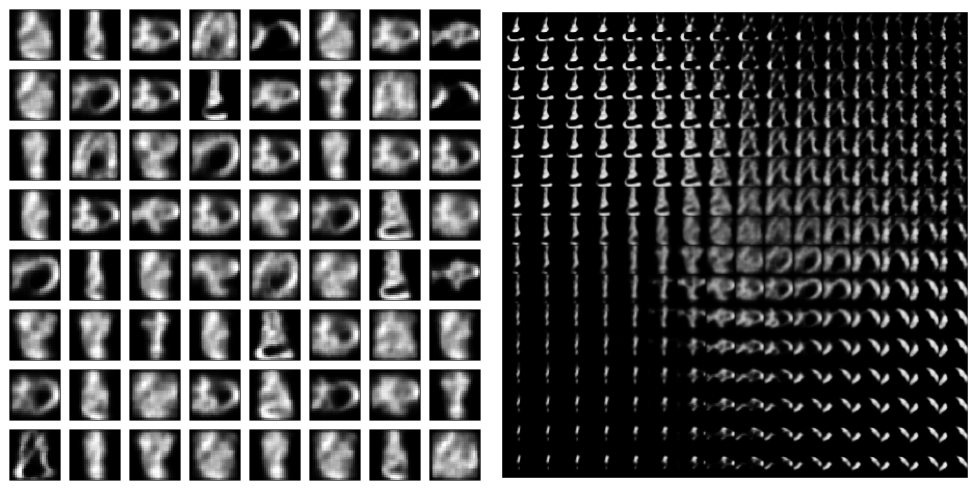 Speaking of results, how do they look? Here we see letters generated after 40 epochs of training. On the left are random letters, on the right, the usual VAE grid display of latent space.