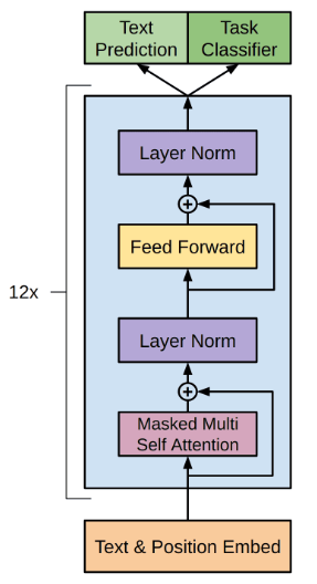 Here is a screenshot from the initial GPT paper (Radford and Narasimhan 2018), visualizing the overall architecture. It is still valid for GPT-2. Token as well as position embedding are followed by a twelve-fold repetition of (identical in structure, though not sharing weights) transformer blocks, with a task-dependent linear layer constituting model output.