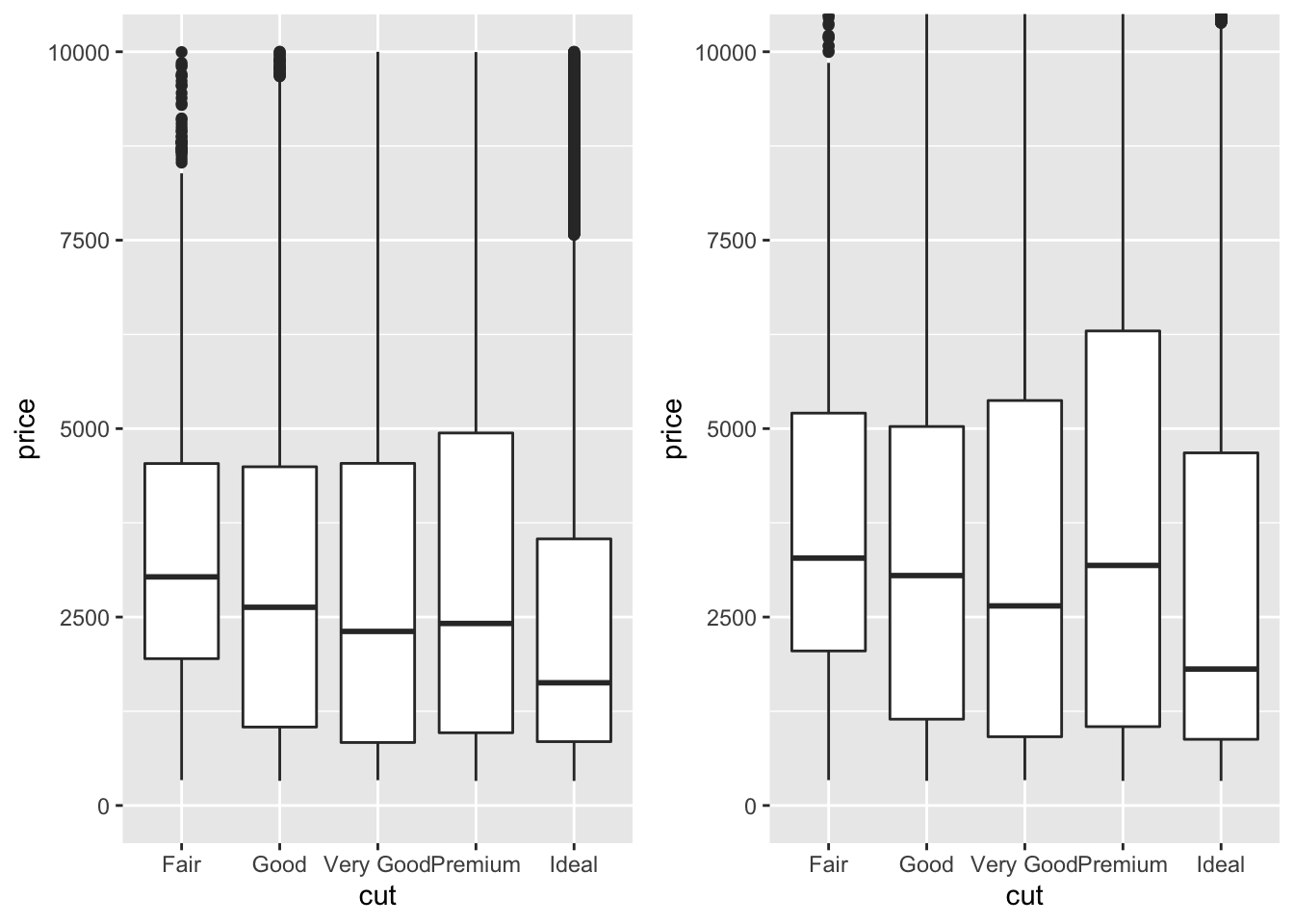 Another common source of confusion in ggplot2 is the difference between scale_(x|y)_continuous(limits = ...) and coord_cartesian((x|y)lim = ...). When setting scale limits (this includes xlim() and ylim()), data is “censored” by default, meaning values outside this range magically turn into NA and disappear; when setting the coordinate system limits, the data are still exist, but data outside the (expanded) limits are not shown.