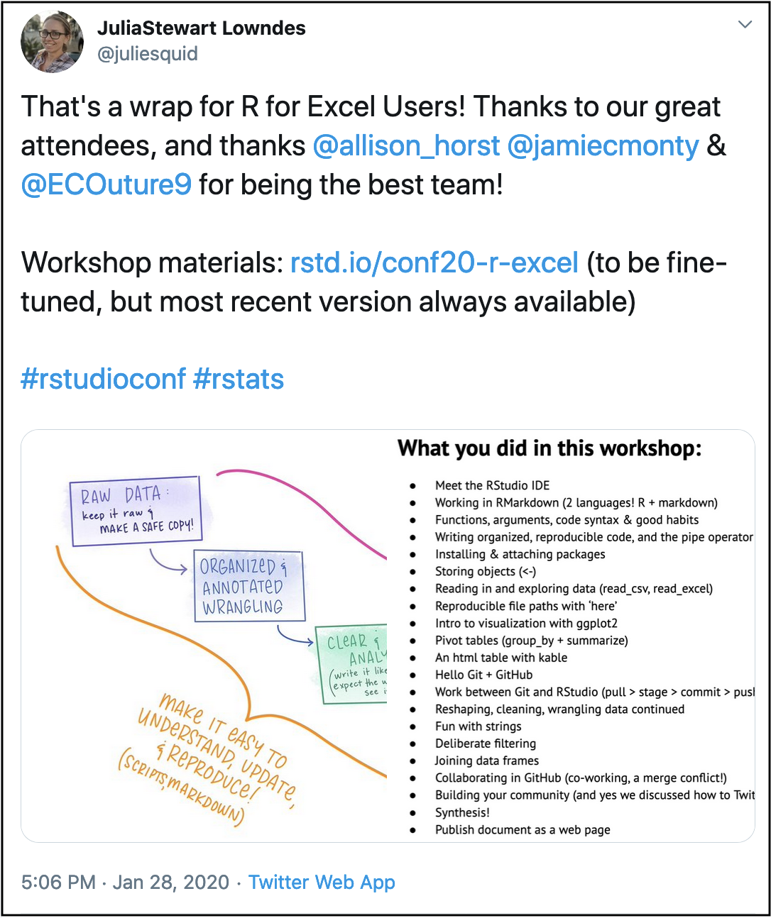 We also got feedback that we should change the name of the course because while it has some framing from Excel, it is certainly not limited to Excel Users. This seems like a good idea. When we were first talking to RStudio’s Alison Hill about the workshop, we discussed how it could be somewhat of a precursor to Jenny Bryan and Jim Hester’s What They Forgot to Teach You About R – ours being What You Should Know When You Learn R. Jenny and Jim’s have a great acronym, WTF, so I have been thinking about names. I learned from Jenny that WTF was a welcome byproduct that came after they came up with the workshop name, but I have to approach it as a backronym . I’ve had many terrible ideas, but! Through cocktail chats at the conference with Charlotte Wickham and Hannah Frick, we landed on TLDR being best. I love Charlotte’s suggestion of Take a Leap and Dive into R or my less-great Time to Learn Data analysis in R. This is an ongoing pursuit, and suggestions are very welcomed :).