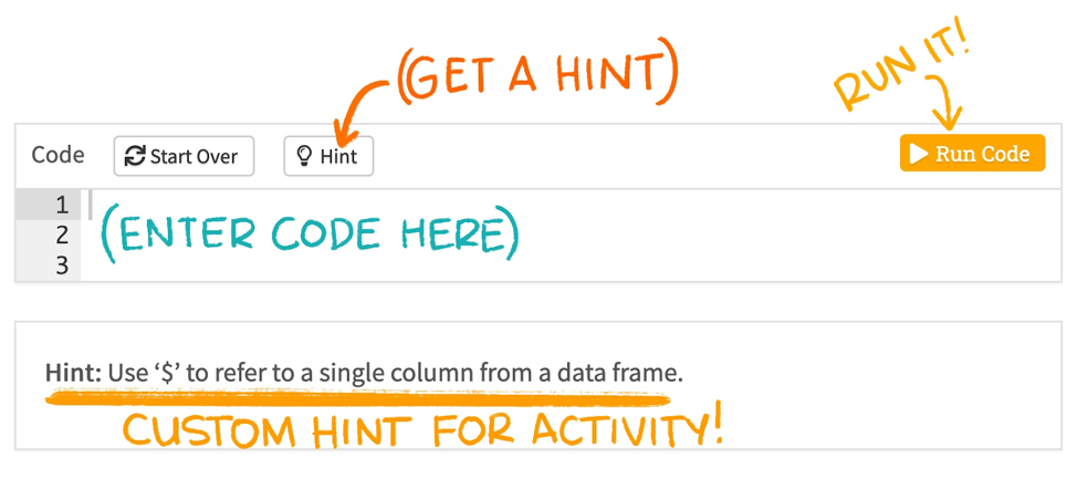 This might be my favorite thing about learnr - it’s easy to add one or more customized hints that students can look to when they get stuck. When learners are working through tutorials on their own, I think this is an awesome option to lead them along without giving away the answer.