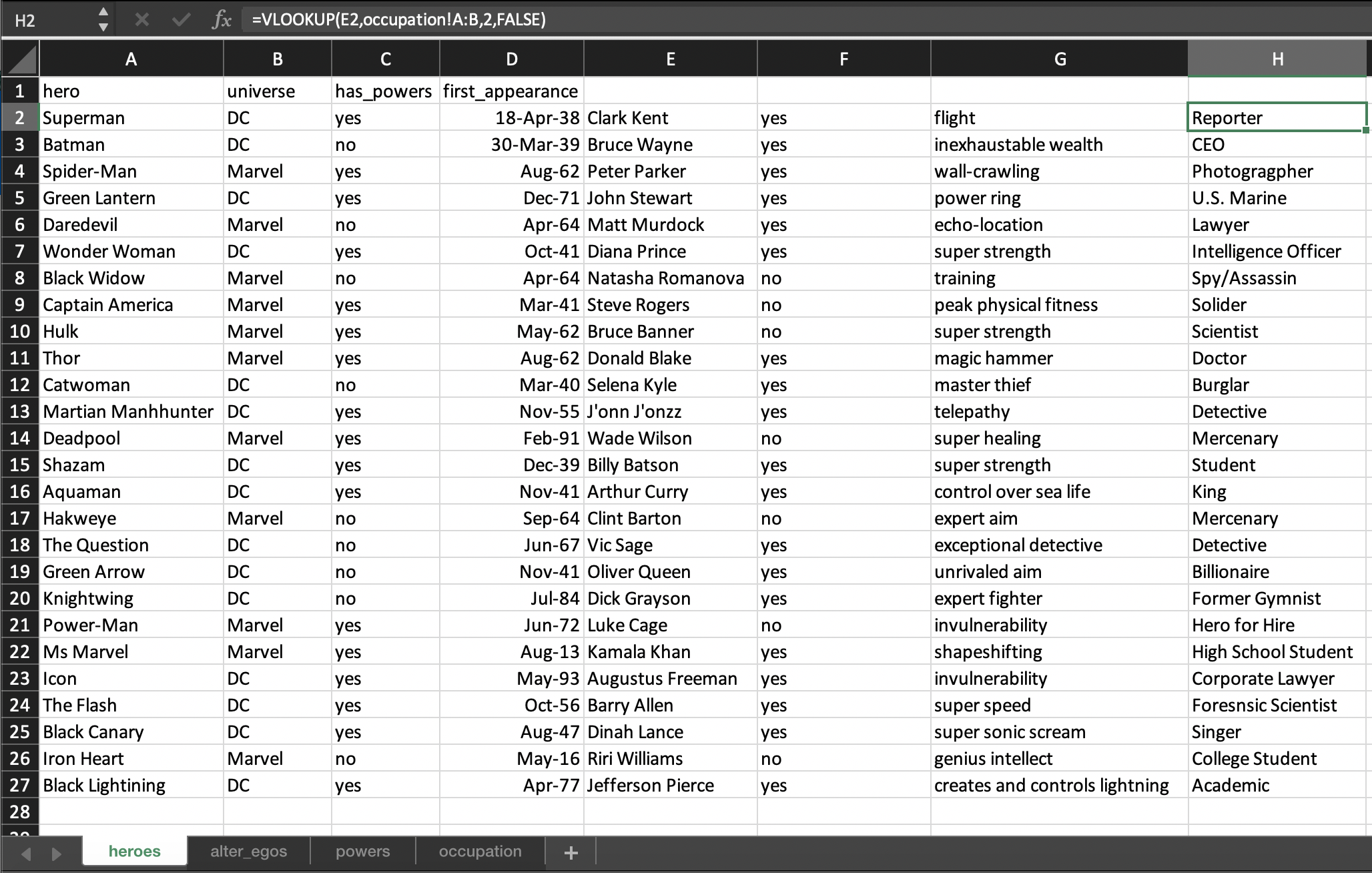 For doing this same task in Excel, we can continue to utilize VLOOKUPS for each additional column of data we want to pull into our main sheet. To bring in our occupation data we simply adjust the initial reference point in our formula from column A2 which houses hero name to E2 which houses alter egos which was also added via a VLOOKUP.