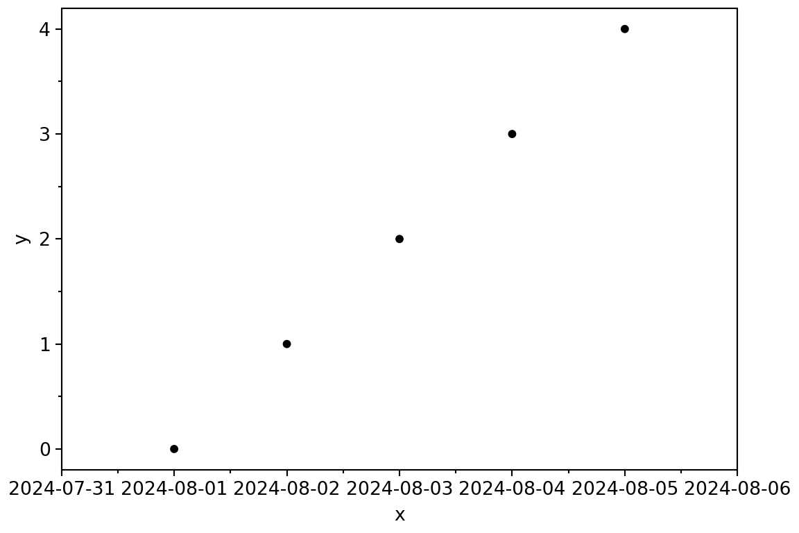 Each of these types covers different ranges and resolutions. The standard library’s datetime has the smallest range, with a constant millisecond (ms) resolution; pandas offers a middle ground with a larger range and nanosecond (ns) resolution; and numpy provides varying resolutions (from years to attoseconds) with different ranges for each resolution. These differences mean that these types are not always directly interchangeable, though we work to make them feel that way. Since our data is stored in a dataframe, any datetime values are converted to the pandas type, which then stores values as numpy types!