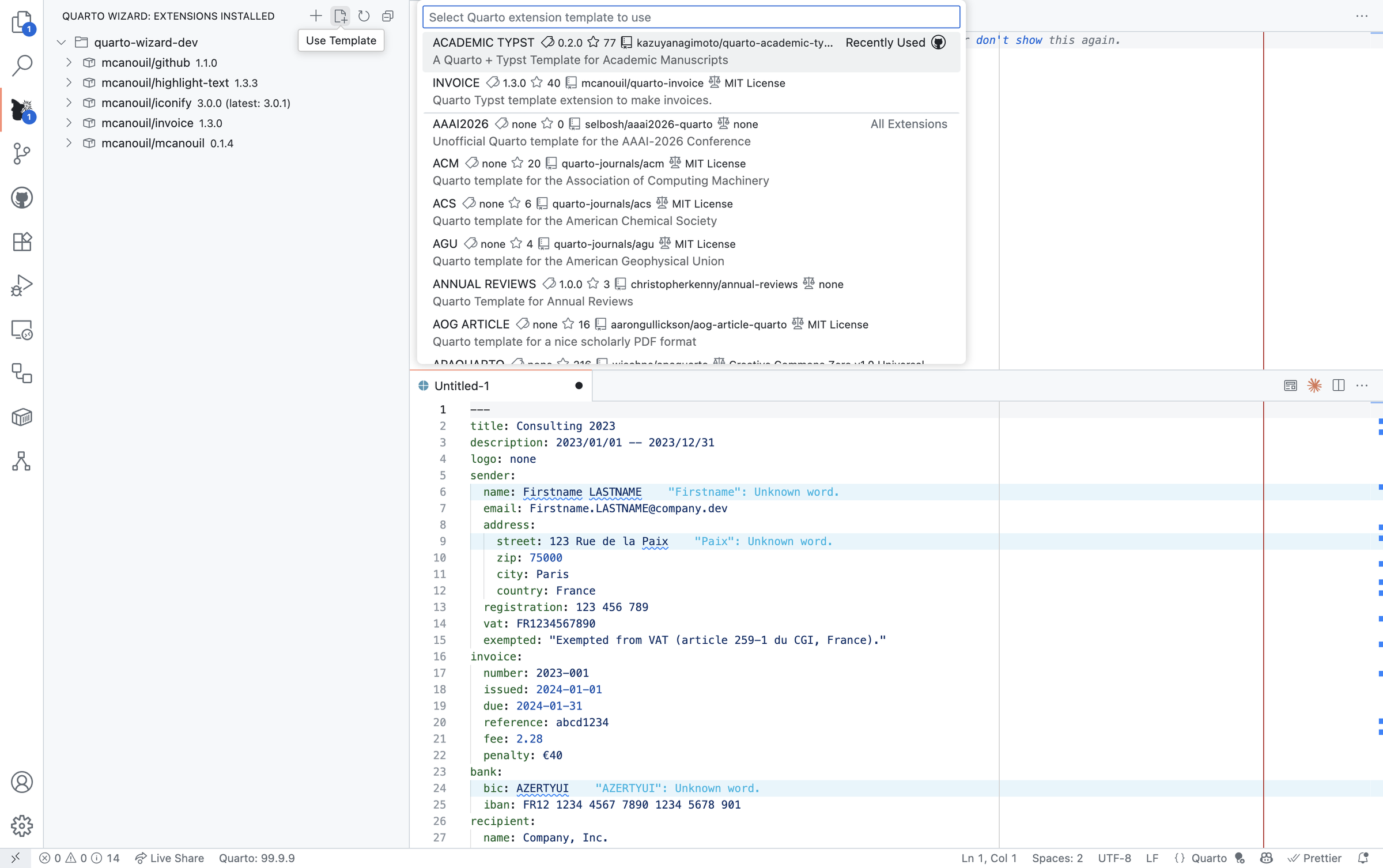 Whether you’re crafting an academic paper using journal-specific formats, creating professional invoices with my Invoice extension template, or building stunning presentations with themed templates like my Reveal.js Coeos extension, browsing available templates becomes as simple as scrolling through a curated gallery.