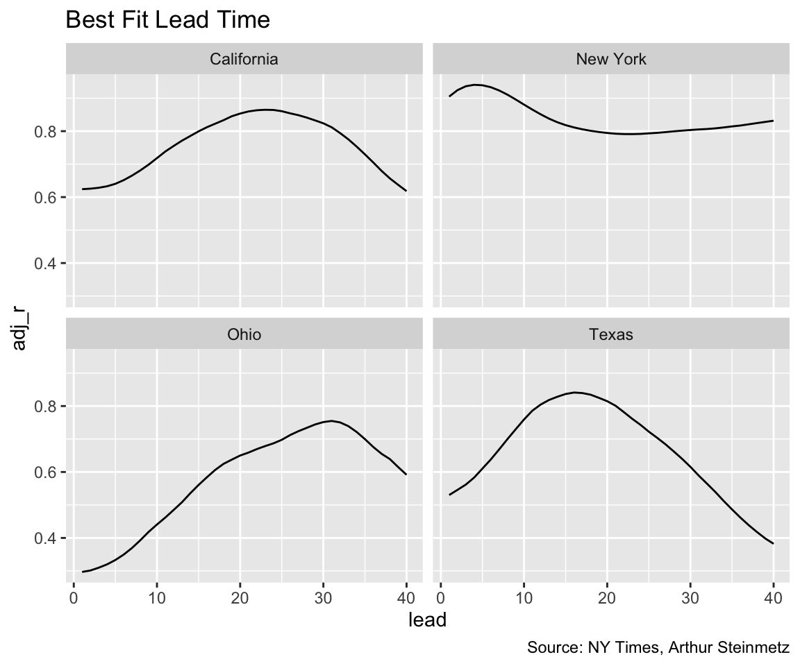 I have been thinking about how to measure mortality lags for a while now. What prompted to do a write-up was discovering a new function in Matt Dancho’s timetk package, tk_augment_lags, which makes short work of building multiple lags. Not too long ago, managing models for multiple lags and multiple states would have been a bit messy. The emerging tidymodels framework from RStudio using list columns is immensely powerful for this sort of thing. It’s great to reduce so much analysis into so few lines of code.