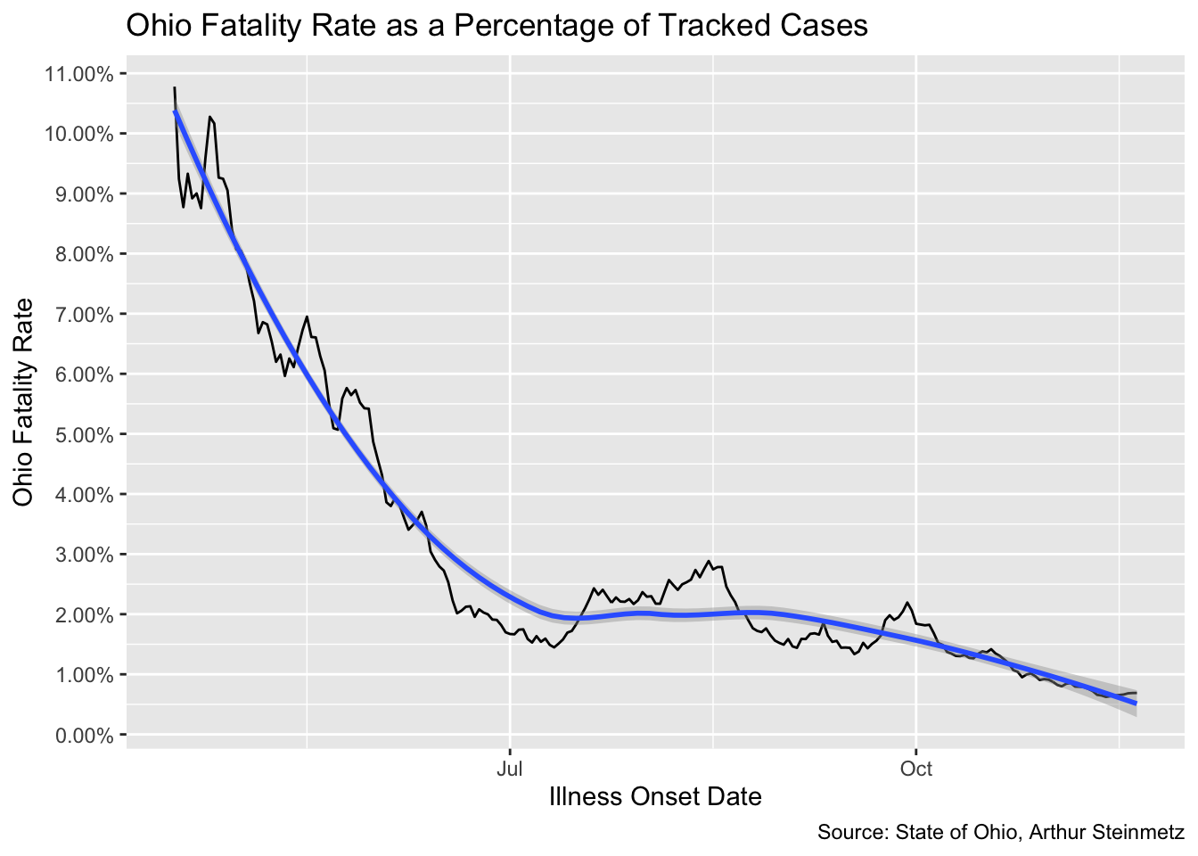 x = "Illness Onset Date", y = "Ohio Fatality Rate",