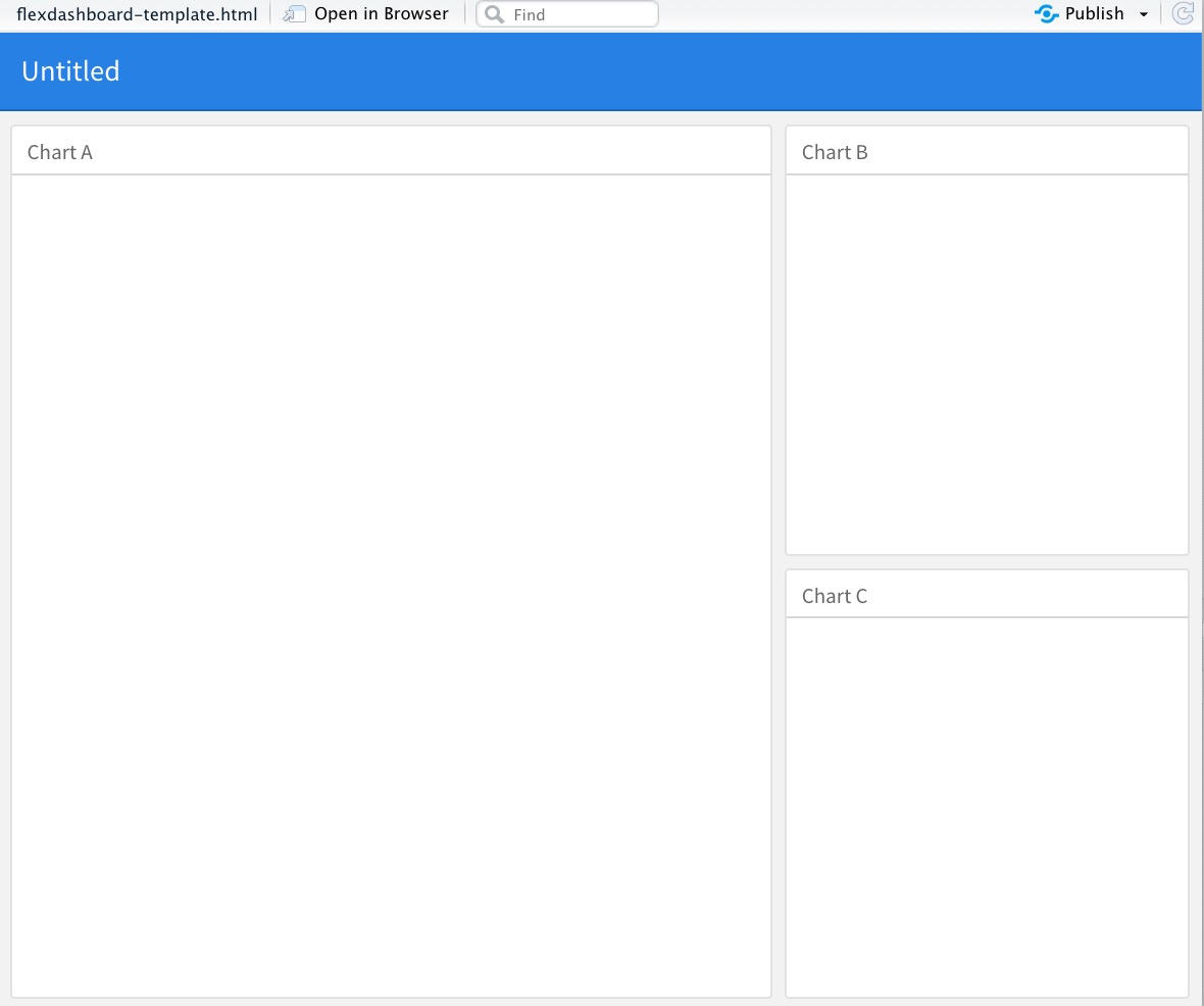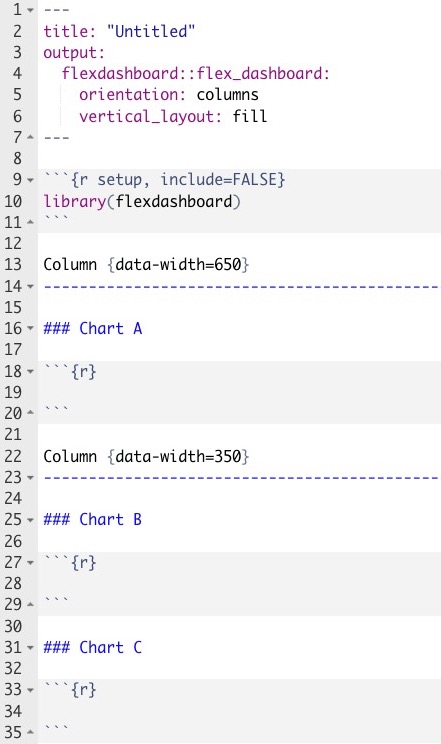 flexdashboardframework uses the same headings and code chunk structure as a regular R Markdown document. This means that we don’t have to learn a new language to build our dashboard. - Flexdashboard allows us to exploit other tools we already know. The R Markdown template for