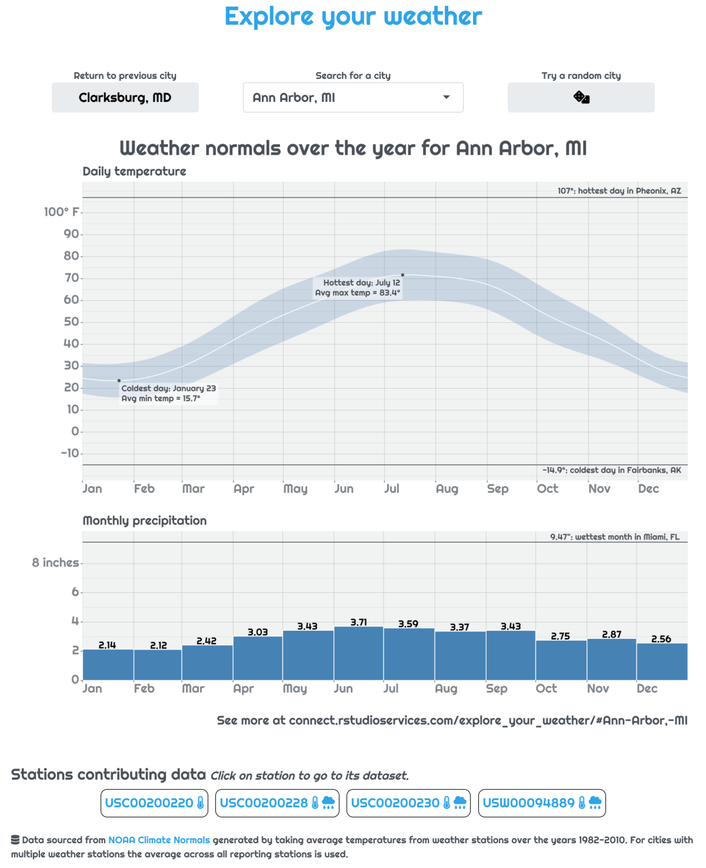 There are lots of interesting measures available in these “normals” but what our app focuses on is the temperature (daily minimum, average, maximum) and precipitation (monthly totals). If you want more info on these data take a look at the NOAA landing page or the scientific manuscript accompanying them.