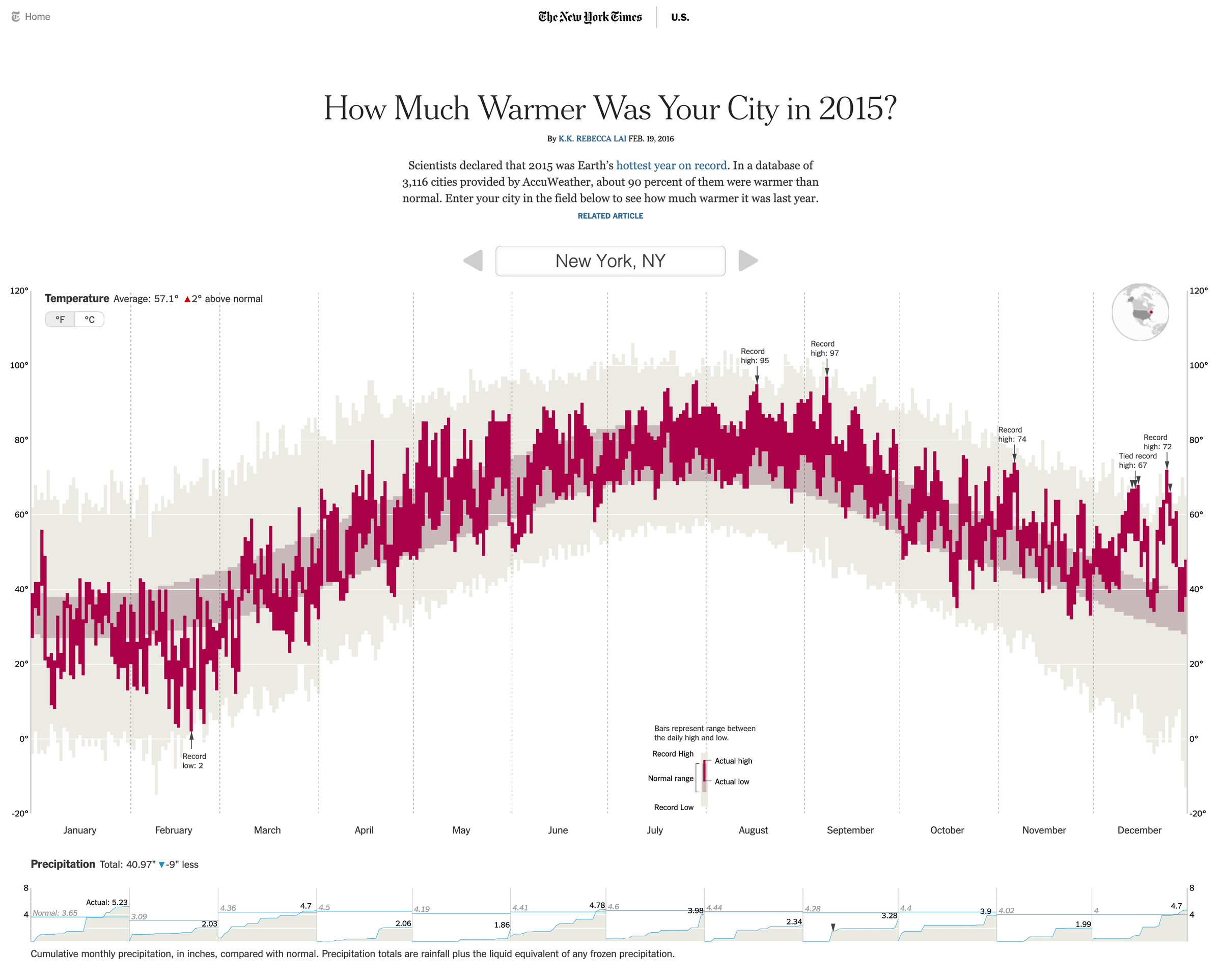 Inspiration for the design came from the story “How Much Warmer Was Your City in 2015?” in the New York Times, by K.K. Rebecca Lai.