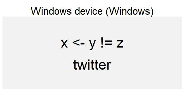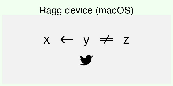 If you’re not familiar with the languages above it can be hard to see what is right and what is wrong. You may, however, look at how the text in the code is rendered in the browser and compare that to the device rendering. If you do that, you can see that the Hebrew script is rendered in the wrong direction for all the non-ragg devices (except Cairo on Linux). For the Arabic and Sindhi it’s even harder to see what’s wrong because the text looks fundamentally different. That’s because both Arabic and Sindhi rely extensively on text substitution rules and ligatures; the way a letter is written depends critically on what letters it is next to. Still, by comparing to the browser rendering you can see that the same devices failing on the Hebrew script fail here as well.