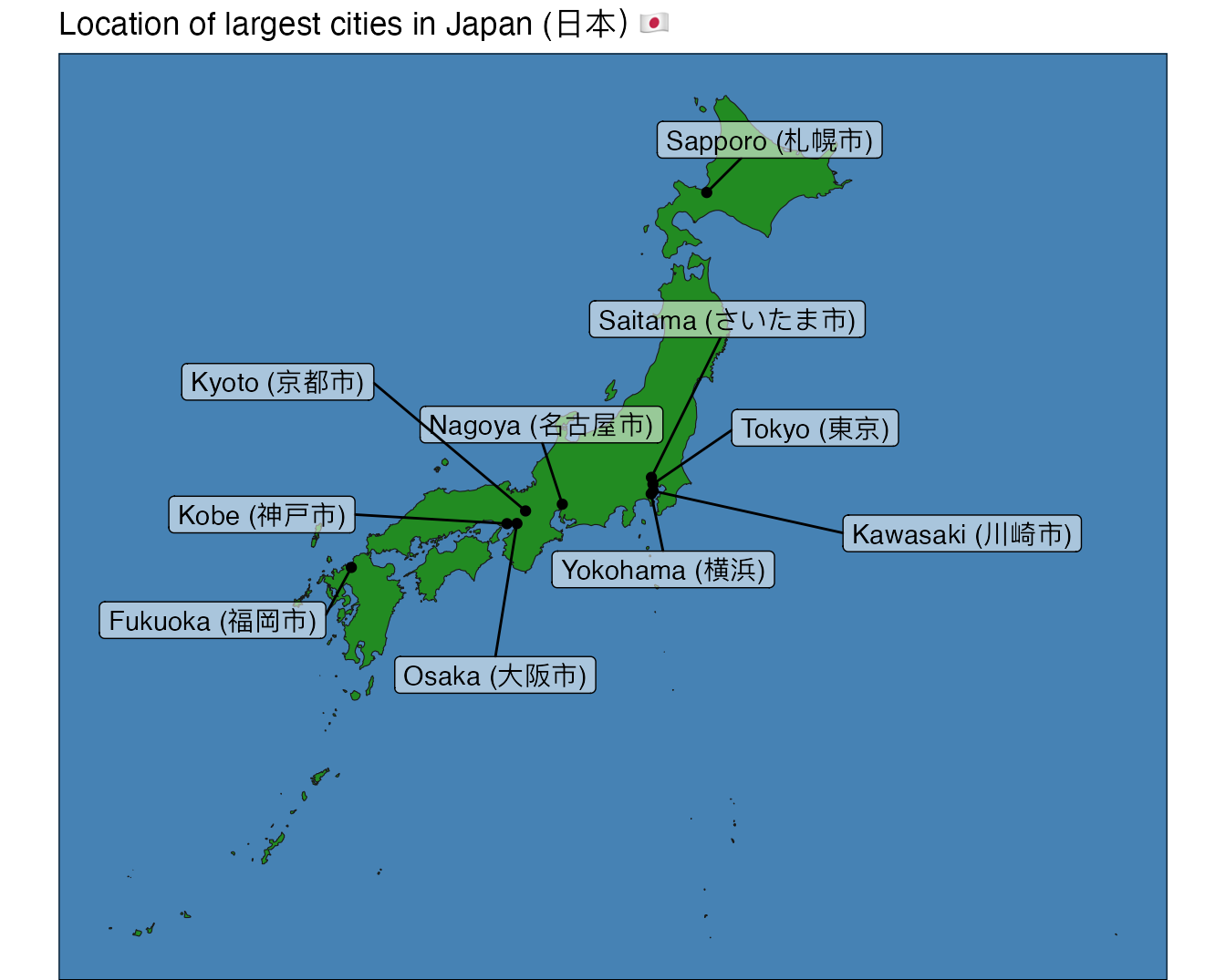 "Location of largest cities in Japan (日本) 🇯🇵"