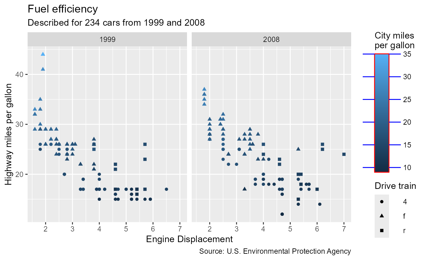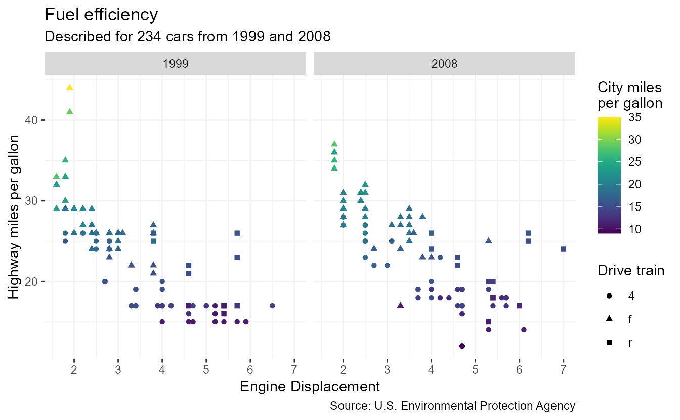 p <- ggplot(mpg, aes(displ, hwy, colour = cty, shape = drv)) +