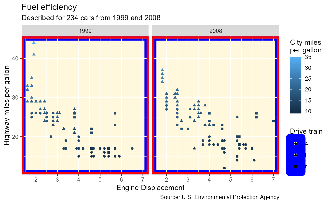 Rather than swapping out complete themes in one fell swoop, themes can also be tweaked to various degrees. In ggplot2, themes are a collection of theme elements, where an element describes a property, or set of properties, for a part of the theme.