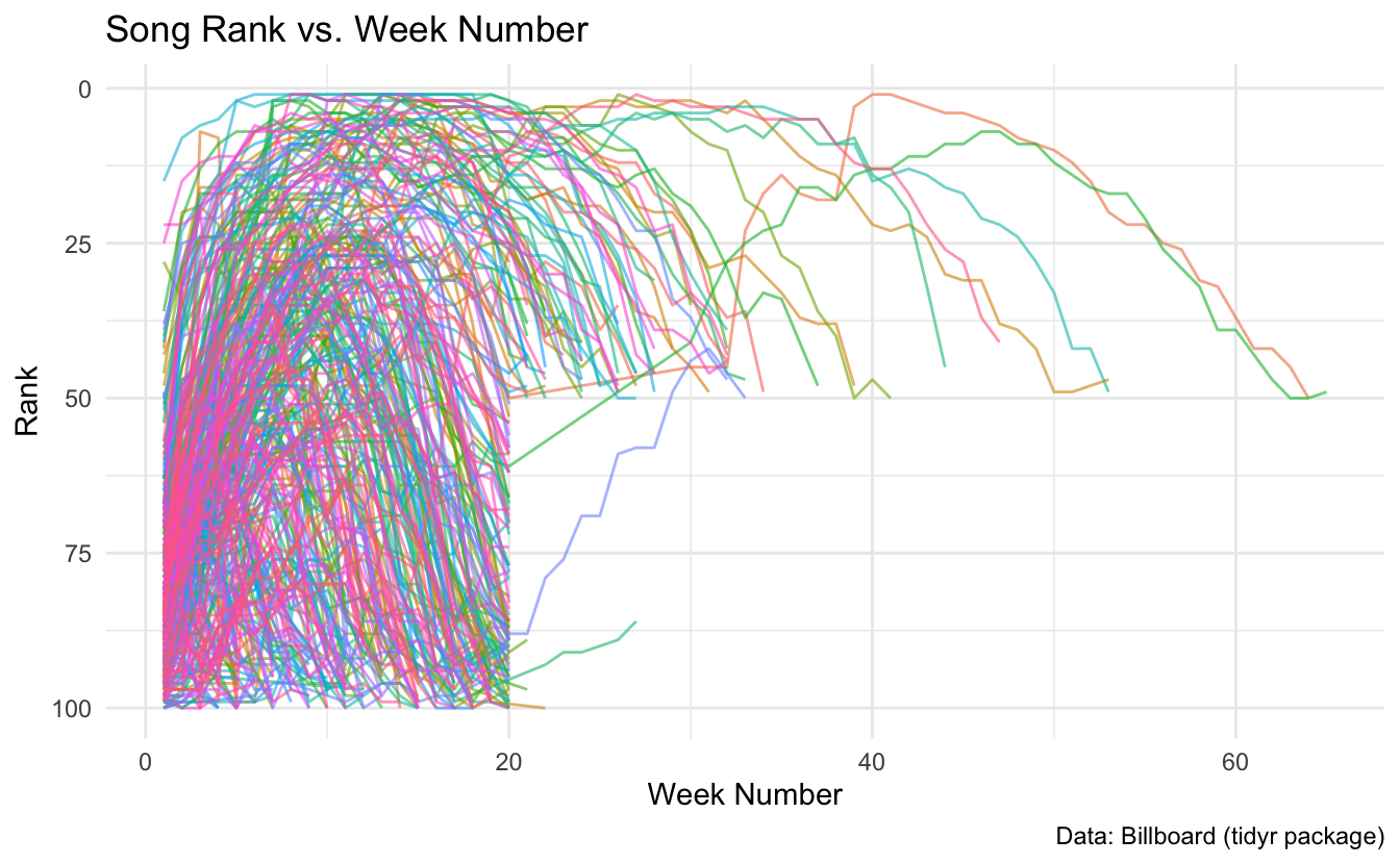 billboarddataset is in wide format, with week columns (wk1,wk2, etc.). We usepivot_longer()to reshape it into a long format with week and rank columns.- Rank vs. Week Plot: Each song’s weekly rankings are connected with lines (