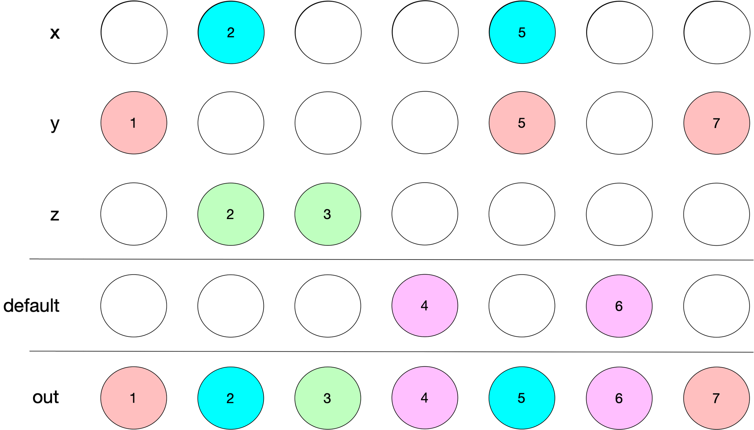 is handling places where x_condition and y_condition overlap. In the image, even though both x and y are selected at location 5, only the value of x is retained since it is hit “first”. This forces us to have to modify y_condition to avoid already “used” locations.